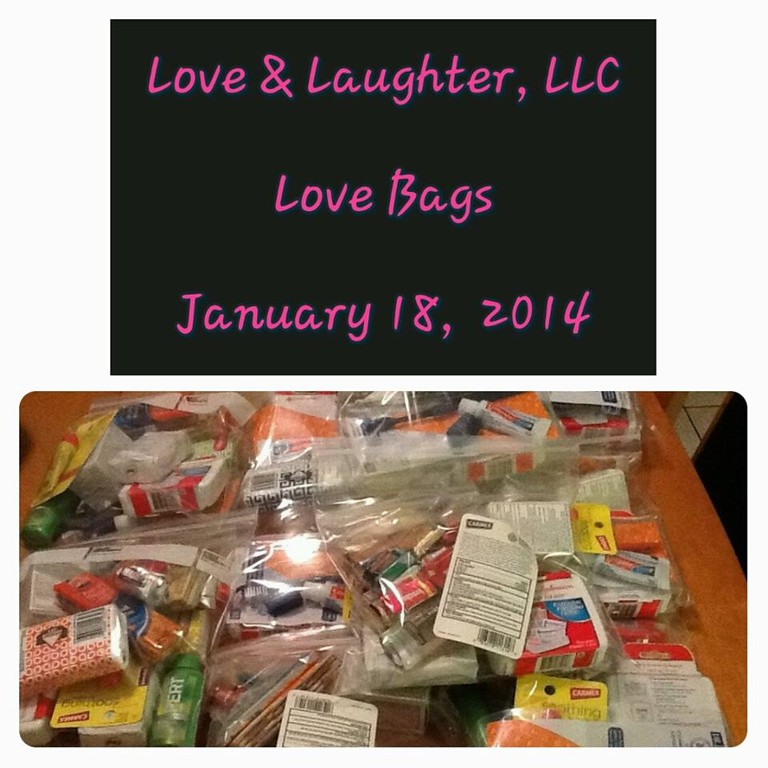 Love & Laughter, LLC takes pride in the work we do for our clients but, our hearts truly go out to those that are unable to help themselves within our community. The 3rd Saturday of each month we go out into the Atlanta Homeless Community and give out Love Bags to those in need. Each bag contains the following items: Shampoo, Soap, Lotion, Toothpaste, Toothbrush, Comb/Brush, Bottle of Water, Gloves, Socks, Hand-warmers, Snack Bars, Nuts, Cold cut sandwiches, Baby Wipes, Feminine products, Food gift card, Deodorant, Mouthwash, Razor, Inspirational Quotes, and a Local resource list- Homeless shelters and Food Banks. Sometimes the contents of the bags may change slightly.